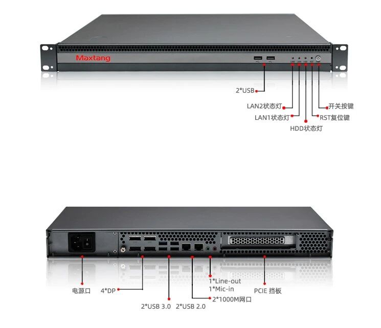 开云手机在线官网X4L服务器在1U的有限空间里布局了4个独立的DP显示接口,一组Line-out + Mic-in,可提供出色的多屏显示体验,也能满足工作站基本音视频处理需求。开云手机在线官网X4L支持6个USB(4*USB2.0 ,2*USB3.0),提供1*PCIe X4,1*PCIe X1,为用户提供充分的扩展空间。