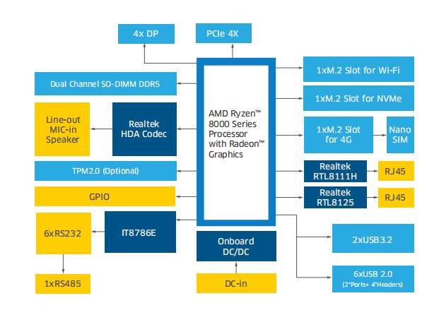 旗舰级处理器性能:搭载AMD Ryzen™ 7 8000系列处理器,基于先进的Zen 4架构,提供8核16线程的强大计算能力,最高加速频率可达5.1 GHz。无论是AI运算、工业自动化还是多媒体处理,都能轻松应对复杂计算需求。